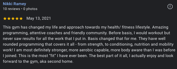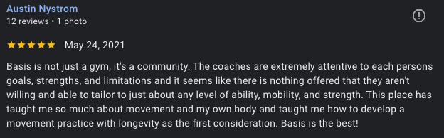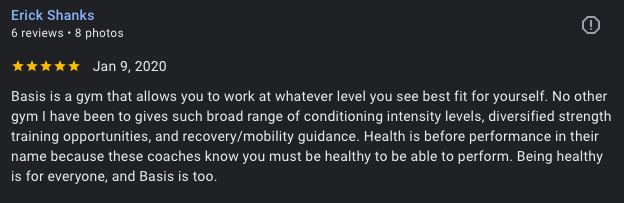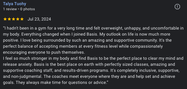 Once you walk through the door, you will feel welcome. You won’t find another gym that takes the time to get to know you personally, focus on your goals, and make a plan to help you get there. Basis wants you to succeed, and every coach is willing to help you do it.”