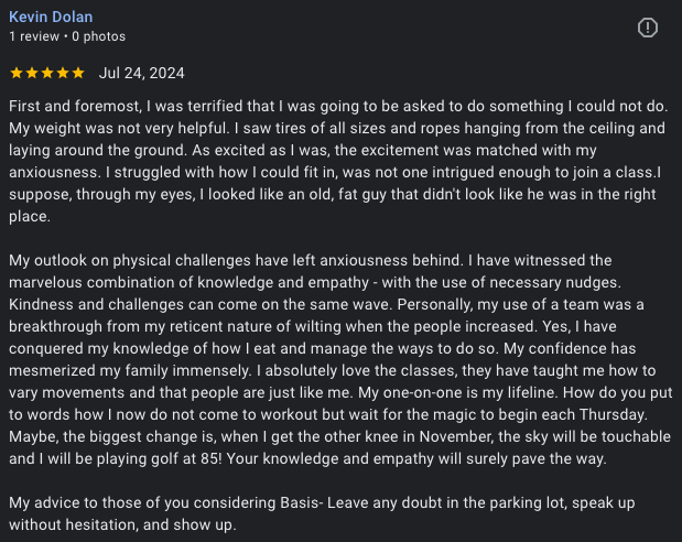 I was blown away by how customized and effective the coaching was. The coaches at Basis are highly skilled, deeply committed, and unlike anything I’ve ever experienced. I wouldn’t even describe Basis as just a gym — it’s a wellness and lifestyle approach that’s way ahead of the curve. The culture is unmatched.