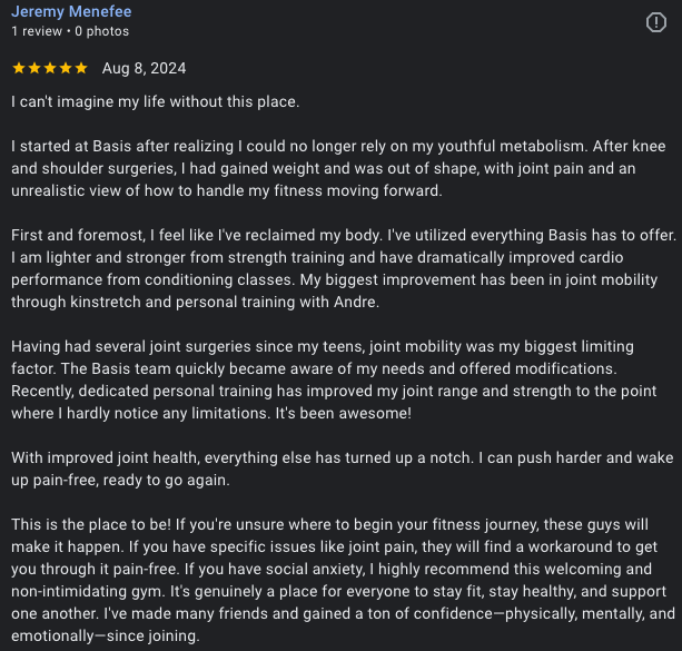 First and foremost, I feel like I've reclaimed my body. I've utilized everything Basis has to offer- Personal Training, individual programming, group training . I am lighter and stronger from strength training and have dramatically improved cardio performance from conditioning classes. My biggest improvement has been in joint mobility through kinstretch and personal training with Andre.